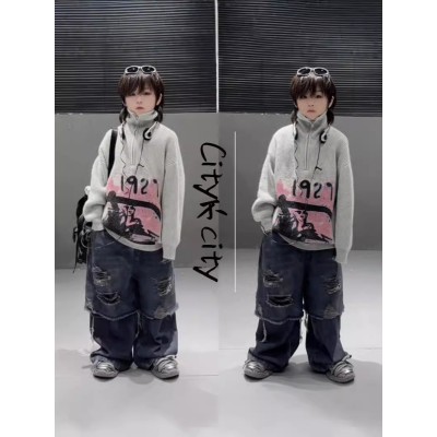 Children's Printed Sweater+Fake Two Piece Pierced Jeans Set