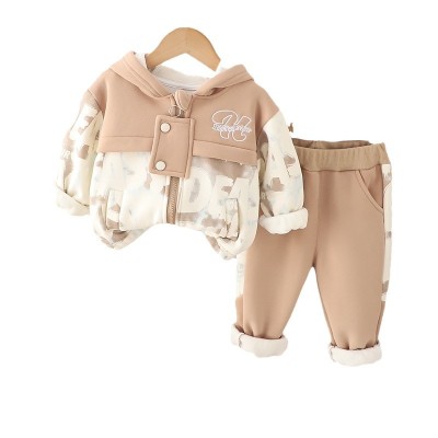 Boys' and Girls' Thick Zipper Coat with Velvet, Splicing Hood, Fashionable and Warm Two Piece Set