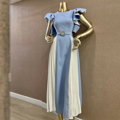 Women's pleated lace pleated color blocked waist belt slim fit dress