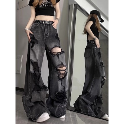 Girl's Street Fashion Super Cool Broken Hole Washed Loose Straight Leg Versatile Jeans
